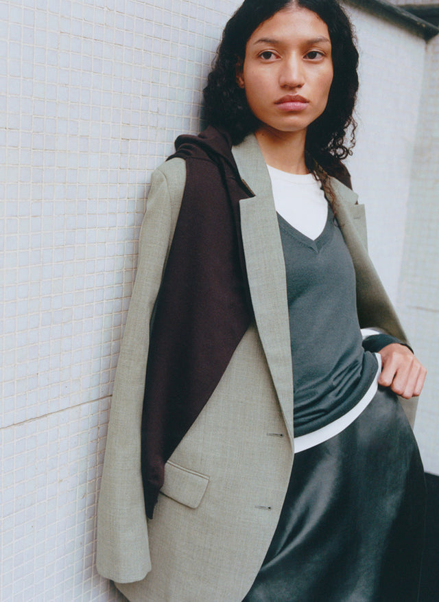 GRENADE is an oversized rosewood-colored organic cotton shirt. Wide cut and topstitched collar provide a relaxed style. Button placket and shirt-tail hem add a modern touch, while the material enhances color vibrancy.